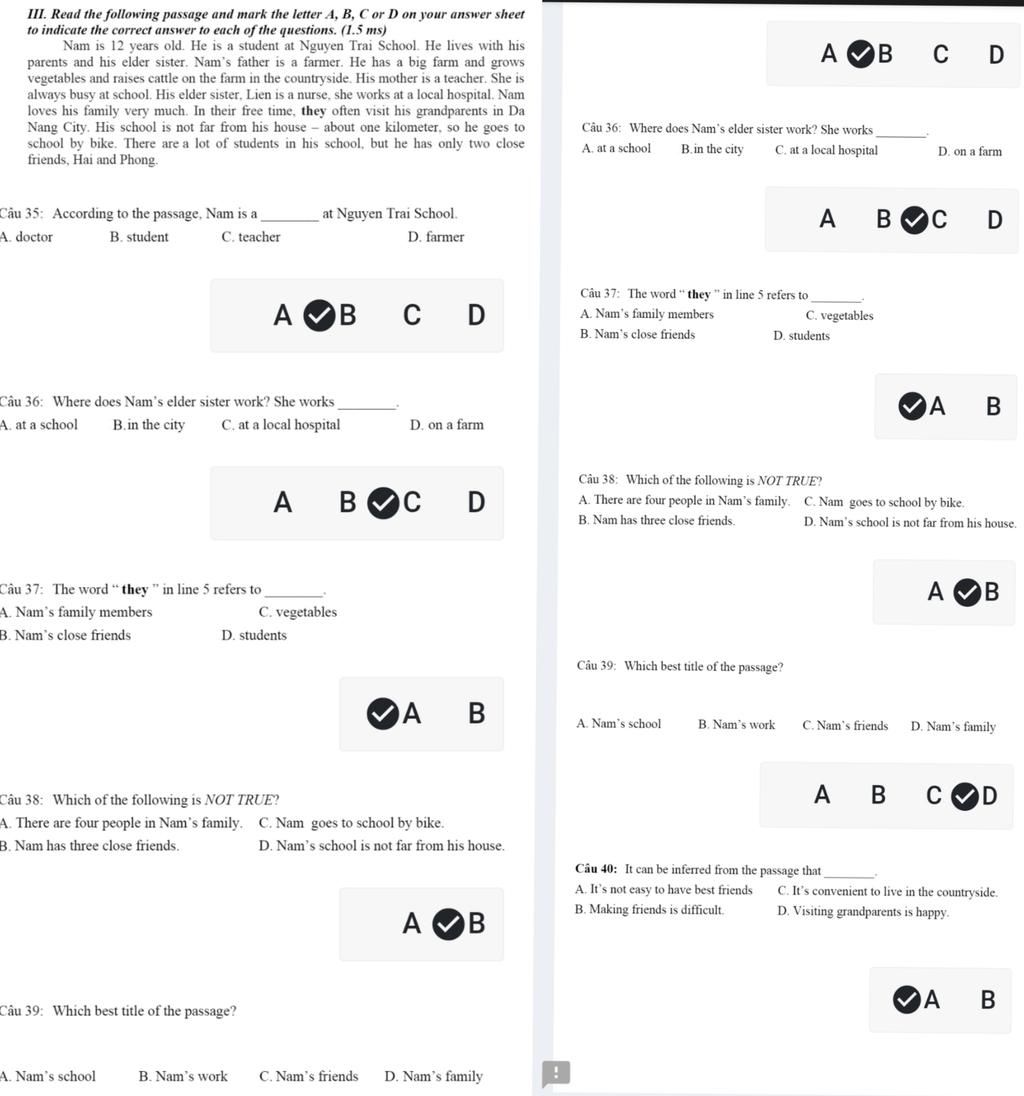 câu 35 đúng vì nó học ở trường nên chọn là học sinh các câu còn lại đúng Mk chỉ giải thích 1 câu thôi vì nếu không giải thích thì nó xoá câu trl của mk