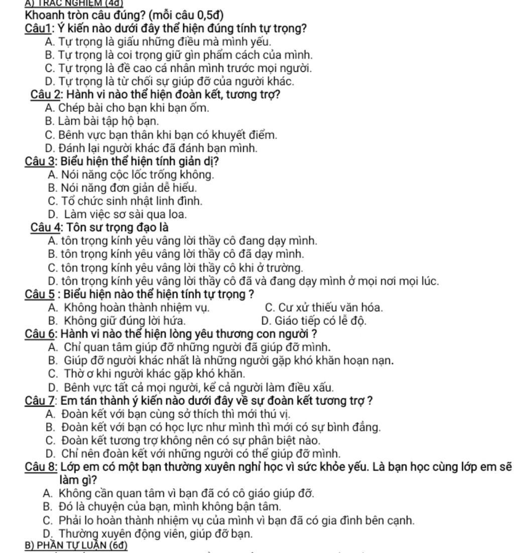 Tự trọng là biết coi trọng và giữ gìn phẩm cách, biết điều chỉnh hành vi của mình cho phù hợp với các chuẩn mực xã hội.
