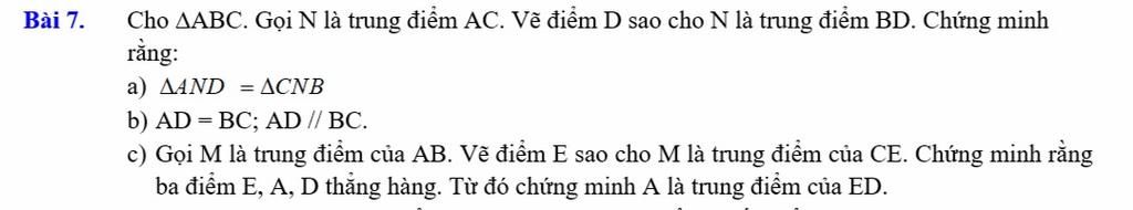 Cho AABC. Gọi N là trung điểm AC. Vẽ điểm D sao cho N là trung điểm BD. Chứng minh