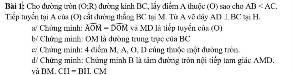 a/ Chứng minh: AOM = DOM và MD là tiếp tuyến của (O)