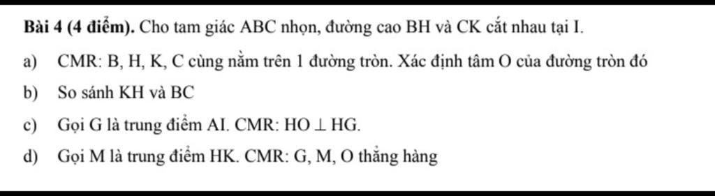 Bài 4 (4 điểm). Cho tam giác ABC nhọn, đường cao BH và CK cắt nhau tại I.
