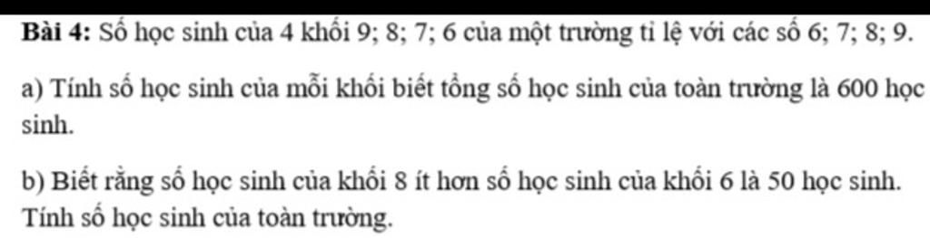 Vậy số học sinh của mỗi khối là 150 học sinh; 175 học sinh; 200 học sinh; 225 học sinh.