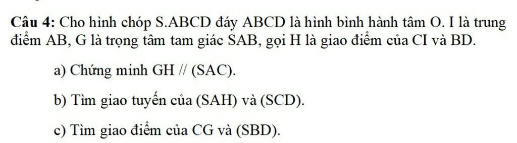 Câu 4: Cho hình chóp S.ABCD đáy ABCD là hình bình hành tâm O. I là trung