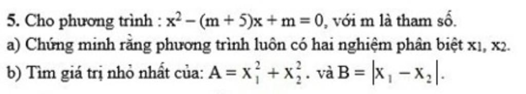 b) Theo viet: $\begin{cases}x_1+x_2=m+5\\x_1x_2=m\end{cases}$