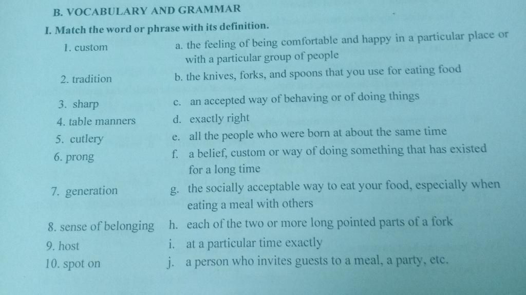 I. Match the word or phrase with its definition.