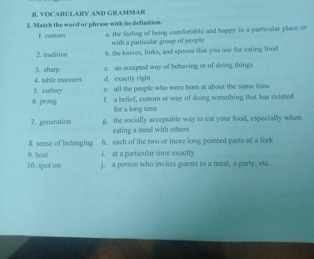 I. Match the word or phrase with its definition.