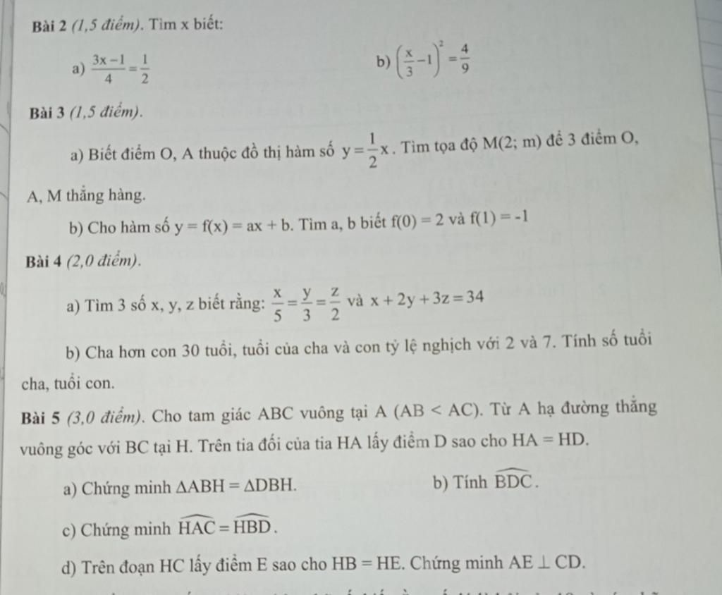 b) Cho hàm số y = f(x) = ax + b. Tim a, b biết f(0) = 2 và f(1) = -1