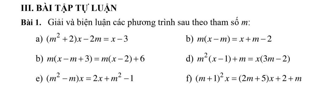 Bài 1. Giải và biện luận các phương trình sau theo tham số m: