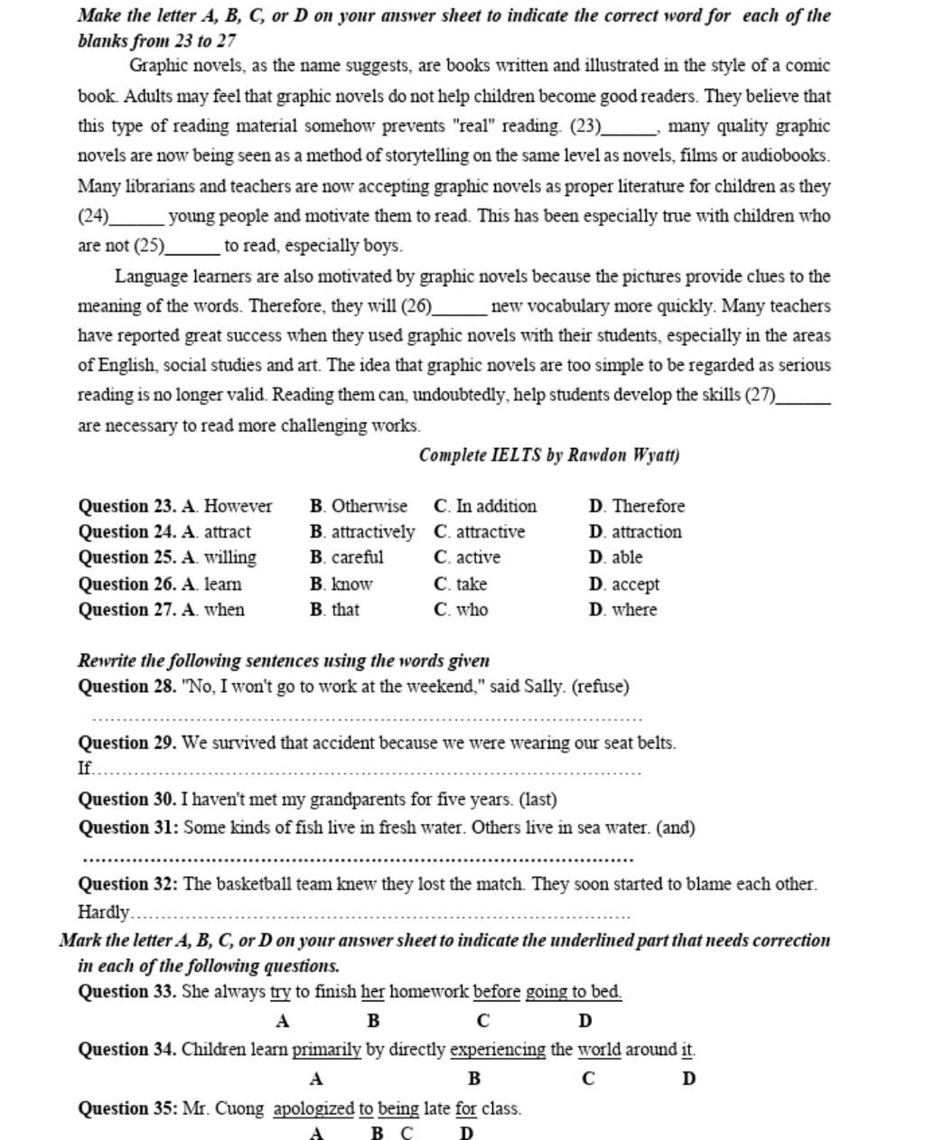 Graphic novels, as the name suggests, are books written and illustrated in the style of a comic book. Adults may feel that graphic novels do not help children become good readers. They believe that this type of reading material somehow prevents "real" reading. (23)______, many quality graphic novels are now being seen as a method of storytelling on the same level as novels, films or audiobooks. Many librarians and teachers are now accepting graphic novels as proper literature for children as they (24)______ young people and motivate them to read. This has been especially true with children who are not (25)______ to read, especially boys.