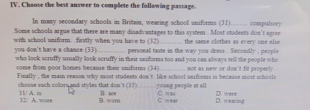 In many secondary schools in Britain, wearing school uniform 31 is compulsory. Some schools argue that there are many disadvantages to this system. Most students don't agree with school uniform.