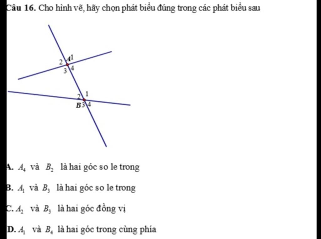 `=>` Góc so le trong là hai góc nằm ở vị trí so le nhau(góc về hai phía đối với cát tuyến)và nằm phía trong của hai đường thẳng song song