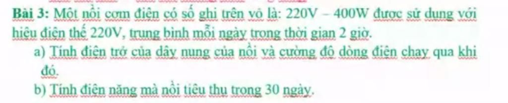 $a) \begin{cases} R=\dfrac{U^2}{\mathscr{P}}=\dfrac{220^2}{400}=121(\Omega)\\I=\dfrac{U}{R}=\dfrac{220}{121}=\dfrac{20}{11}(A) \end{cases}$