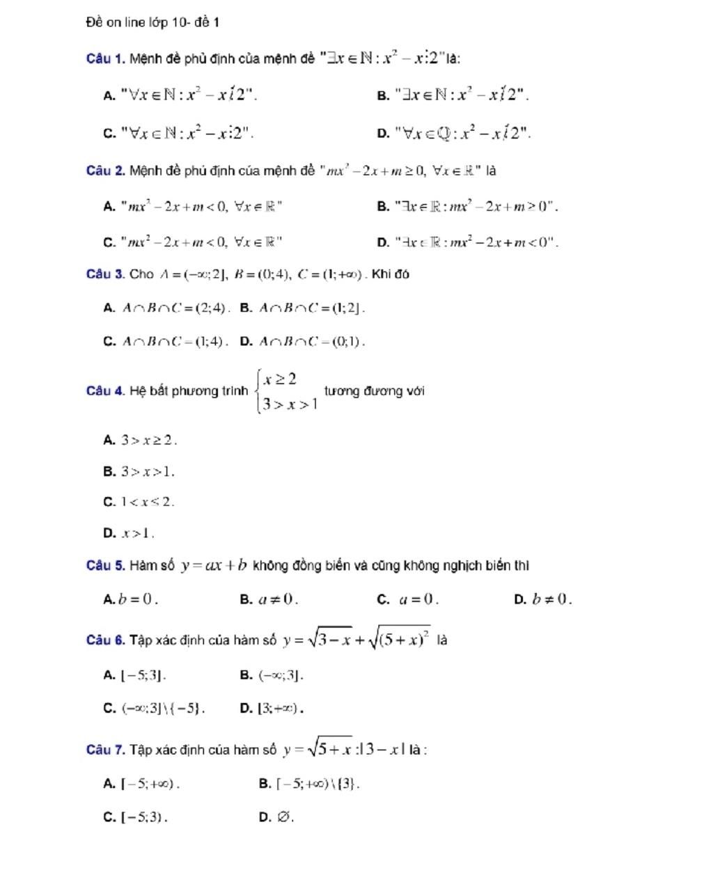 Đề on line lớp 10- để 1