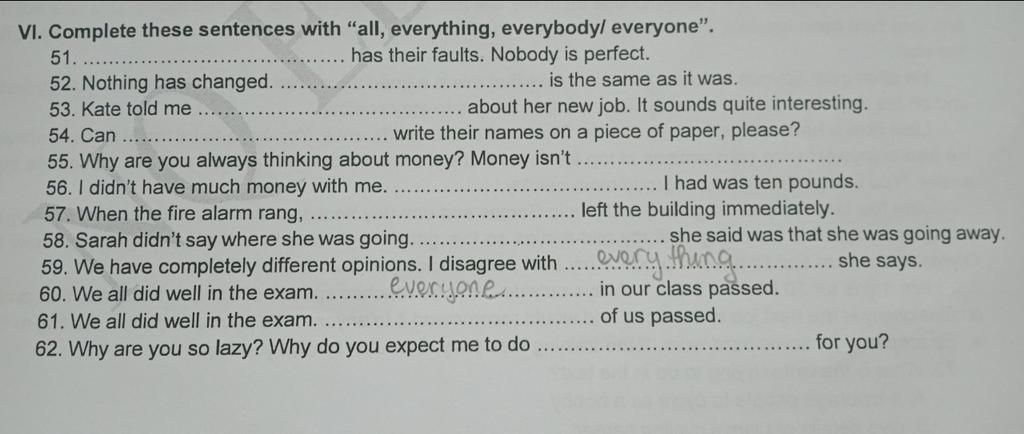 VI. Complete these sentences with "all, everything, everybodyl everyone".