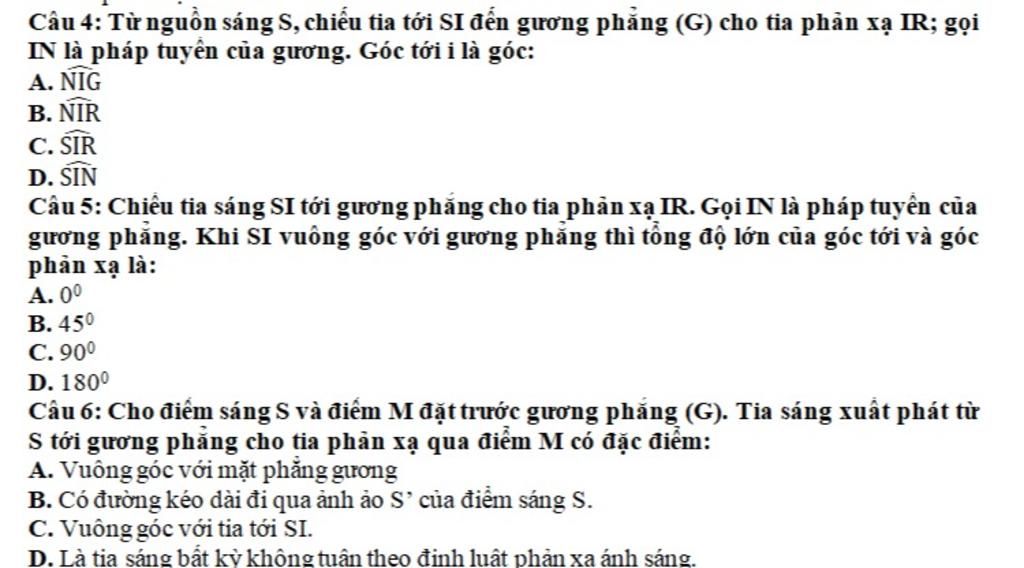 Câu 5: Chiều tia sáng SI tới gương phắng cho tia phản xạ IR. Gọi IN là pháp tuyển của