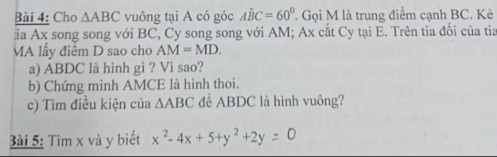 Bài 4: Cho AABC vuông tại A có góc ABC= 60°. Gọi M là trung điểm cạnh BC. Kẻ