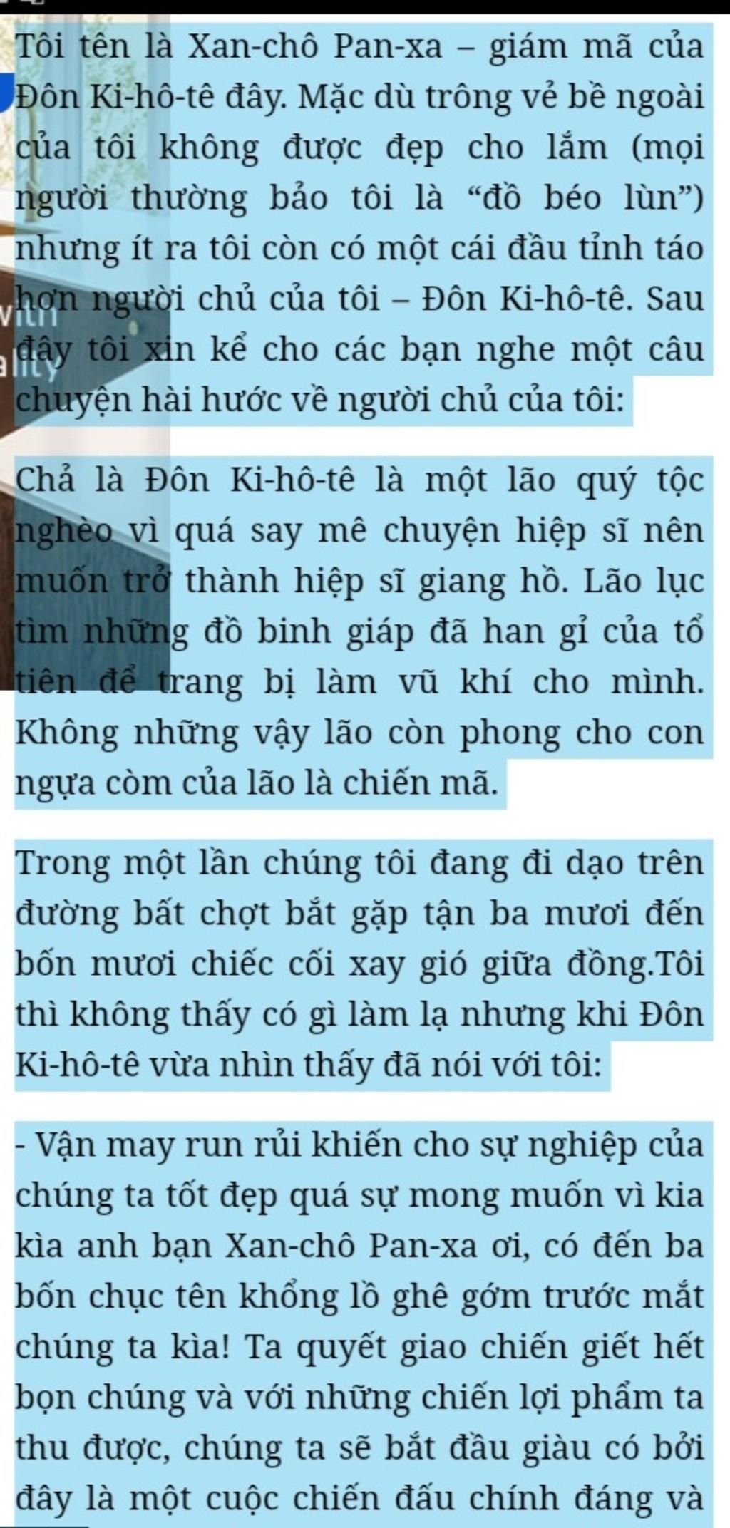 - Cầu Chúa hết sức phù hộ cho!- tôi đỡ Đôn-ki-hô- tê dậy và đỡ lão ngồi lên con ngựa cũng đã bị rách toạc nửa vai.