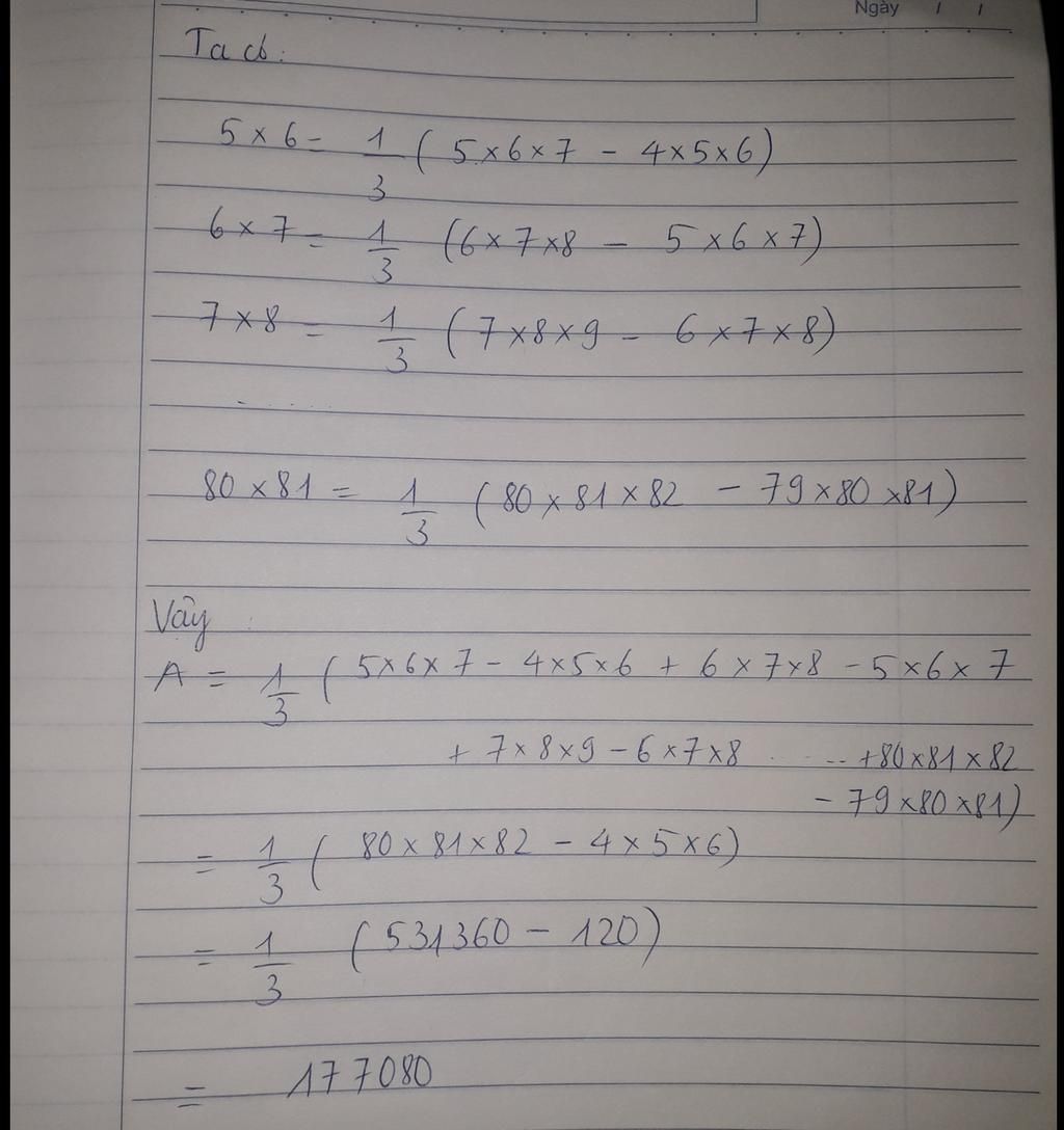 ⇒`3A = 5.6.3 + 6.7.3 + 7.8.3 + 8.9.3 + ...+ 80×81×3`