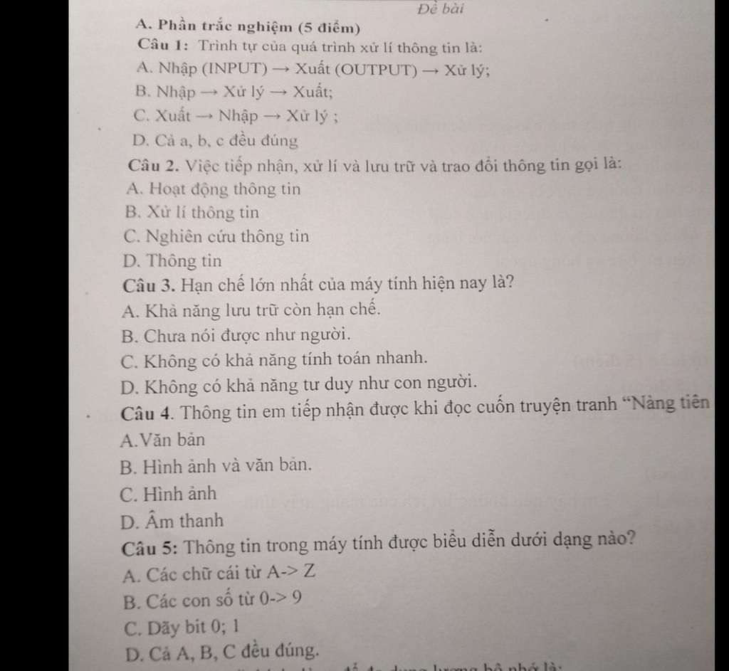 Câu 2. Việc tiếp nhận, xử lí và lưu trữ và trao đổi thông tin gọi là: