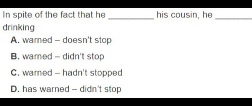 - Xét theo nghĩa của câu thì câu này chia ở thì quá khứ đơn vì hành động cảnh báo chắc chắn là quá khứ rồi còn việc vẫn không bỏ rượu thì có thể chia ở hiện tại hoàn thành để diễn tả việc làm từ trong quá khứ kéo dài đến hiện tại, nhưng ở đáp án không có lựa chọn này nên ta có thể chọn qúa khứ đơn và ta hiểu rằng việc vẫn không bỏ rượu là hành động xảy ra trong quá khứ cùng với việc cảnh báo.