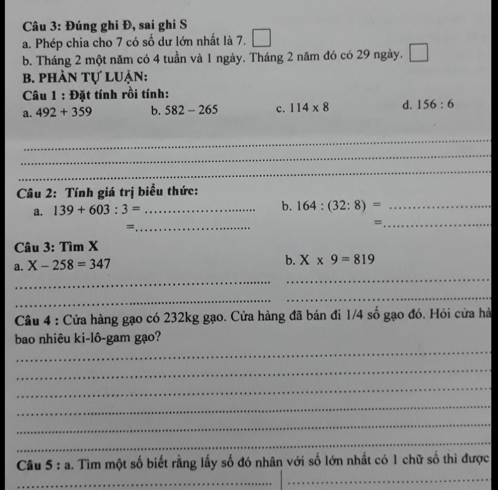 a, Phép chia cho 7 có số dư lớn nhất là 7 | S |