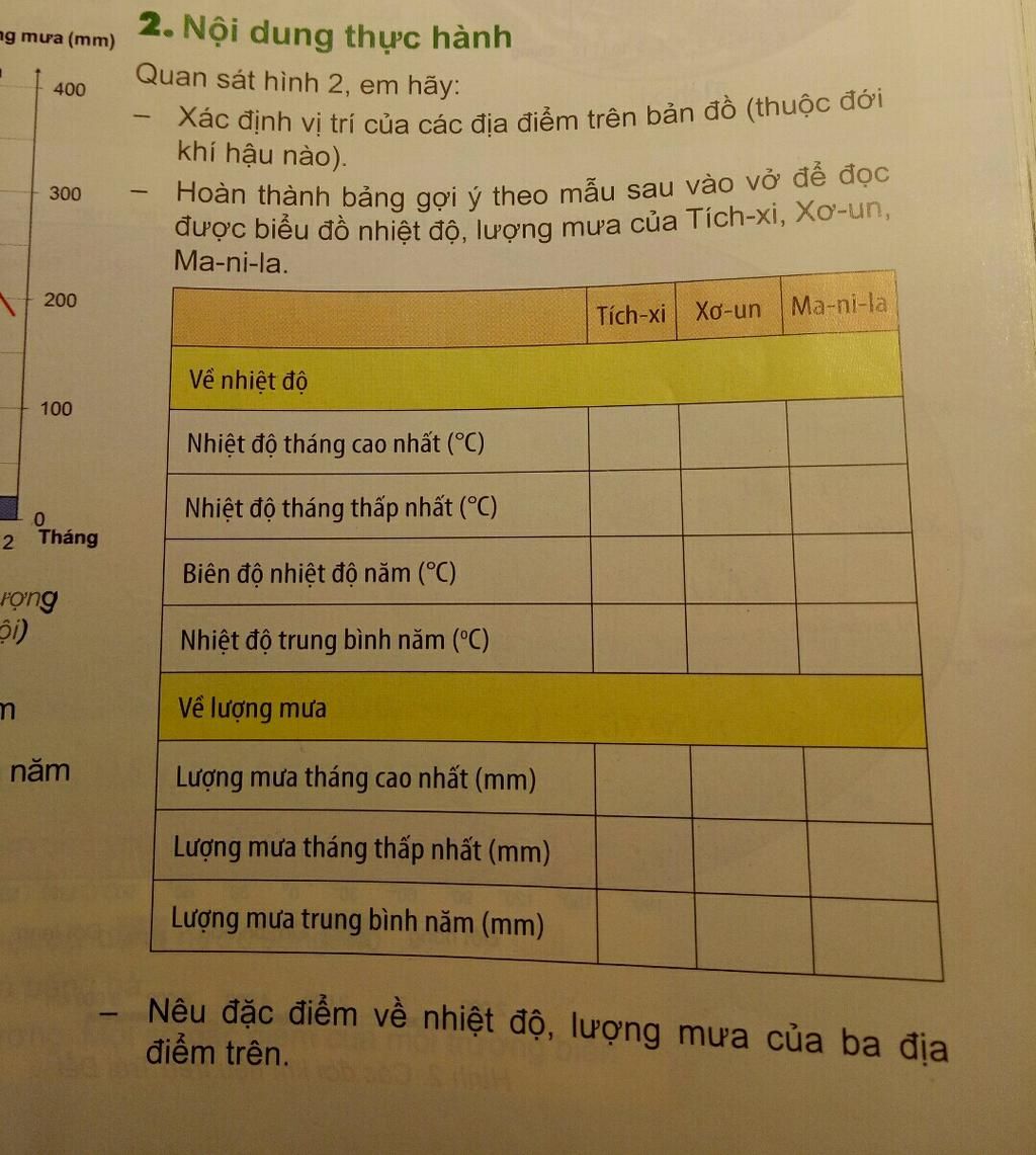 - Bảng nhiệt độ, lượng mưa ba địa điểm: Ma-ni-la, Xơ-un và Tich-xi