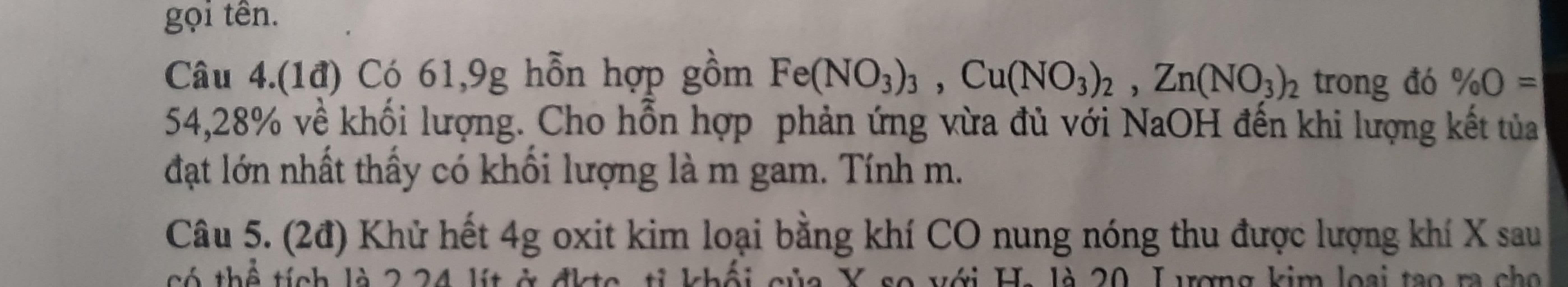 Câu 5. (2đ) Khử hết 4g oxit kim loại bằng khí CO nung nóng thu được lượ ...