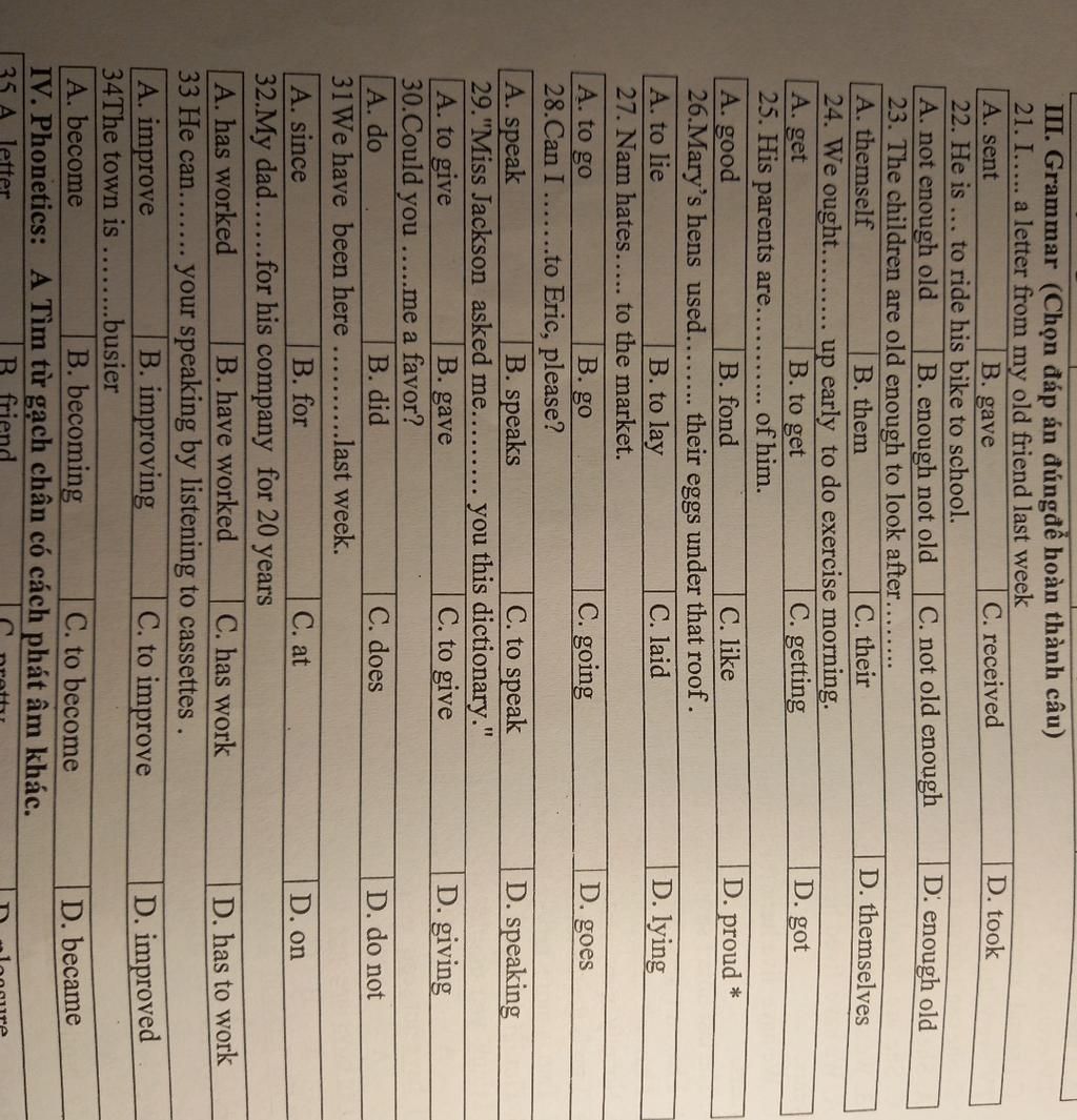 Câu 32: A ( has worked) ( Hiện tại hoàn thành dhnb: for 20 years)