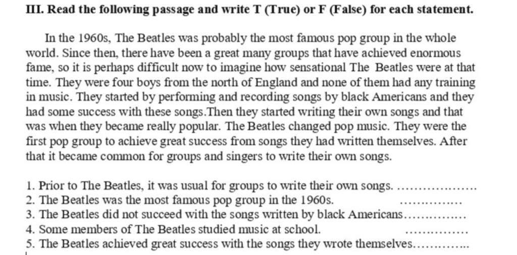 - Câu đầu tiên của đoạn văn: "In the 1960s, The Beatles was probably the most famous pop group in the whole world".