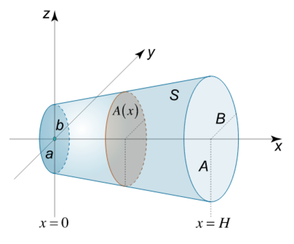 $A(x)=\pi\left[{a+(A-a)\dfrac{x}{H}}\right]\left[{b+(B-b)\dfrac{x}{H}}\right]=\pi\left[{ab+(bA+aB-2ab)\dfrac{x}{H}+(AB-aB-bA+ab)\left({\dfrac{x}{H}}\right)^2}\right]$
