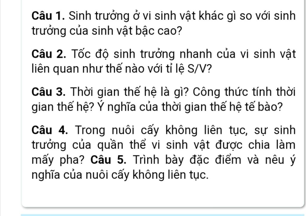 Câu 4 :Sự sinh trưởng của vi sinh vật trong nuôi cấy không liên tục bao gồm 4 pha cơ bản; pha tiềm phát, pha cấp số, pha cân bằng và pha suy vong.