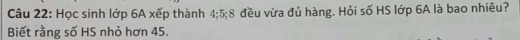 Số hs lớp 6A thuộc ƯC\left(4,5,8\right)=Ư\left(40\right)=\left\{0;40;80;...\right\}ƯC(4,5,8)=Ư(40)={0;40;80;...} và nhỏ hơn 45 nên lớp 6A có 40 hs
