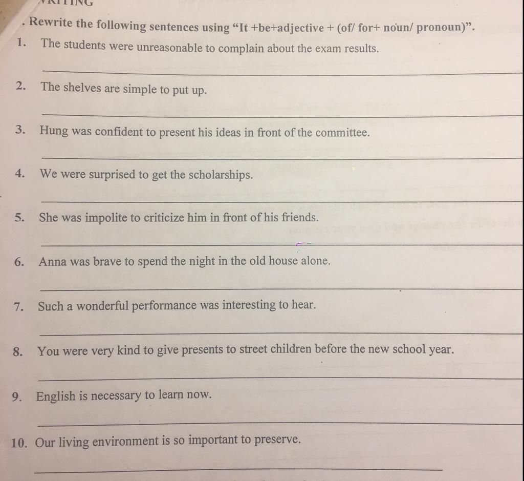 Rewrite the following sentences using "It +be+adjective + (of/ for+ noun/ pronoun)".