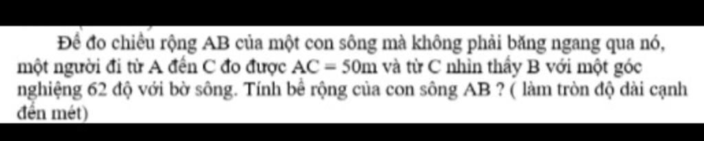 nghiệng 62 độ với bờ sông. Tính bề rộng của con sông AB ? ( làm tròn độ dài cạnh