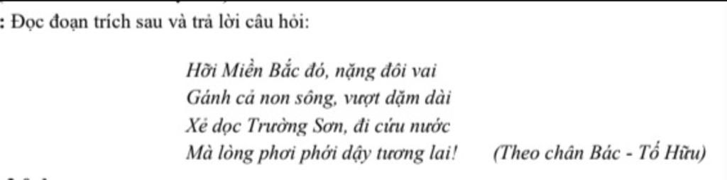 - Hai câu “Xẻ dọc Trường Sơn đi cứu nước/Mà lòng phơi phới dậy tương lai” trong đoạn trên gợi cho em liên tưởng tới những phẩm chất của người lính lái xe Trường Sơn trong “Bài thơ về tiểu đội xe không kính” (Phạm Tiến Duật): những người lính lái xe Trương Sơn trong "Bài thơ về tiểu đội xe không kính" là những người kiên cường, bất khuất, dũng cảm. Dù có khó khăn, nguy hiểm đến đâu, họ vẫn băng băng trên những con đường để vào miền Nam giải phóng đất nước.Điều này được thể hiện rõ qua câu thơ: " Xe vẫn chạy vì miền Nam phía trước/Chỉ cần trong xe có một trái tim."