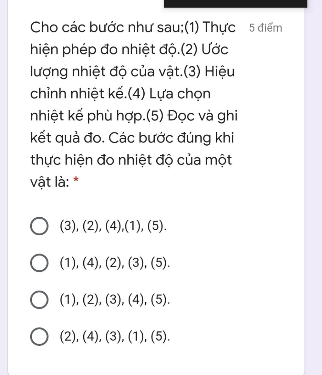 Các bước đúng khi thực hiện đo nhiệt độ của một vật là: B1:Ước lượng nhiệt độ của vật B2:Lựa chọn nhiệt kế phù hợp B3:Hiệu chỉnh nhiệt kế B4:Thực hiện phép đo nhiệt độ B5:Đọc và ghi kết quả đo =>Chọn D.(2),(4),(3),(1),(5)