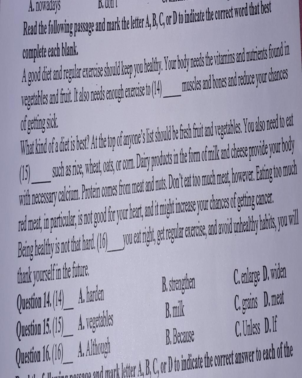 A good diet and regular exercise should keep you healthy. Your body needs the vitamins and nutrients fou vegetables and fruit. It also needs enough exercise to (14) strengthen. of geting sick. What kind of a diet is best? At the top of anyone's list should be fresh fruit and vegetables. You also need (15) grains muscles and bones and reduce your char such as rice, wheat, oats, or com. Dairy products in the form of milk and cheese provide your with necessary calcium. Protein comes from meat and nuts. Don't eat too much meat, however. Eating to red meat, in particular, is not good for your heart, and it might increase your chances of geting cancer. Being healthy is not that hard. (16) If you eat right,get egulr exercise, and avoid unhealthy habis y thank yourselfin thefuture.