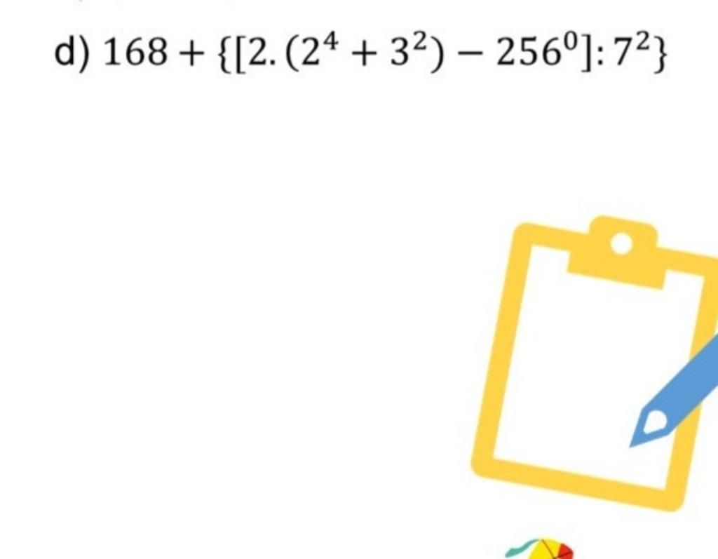 168 +{[2.( $2^{4}$ + $3^{2}$ )-$256^{0}$ ] : $7^{2}$ }