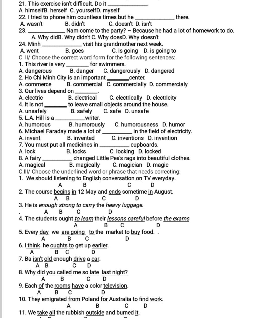3. Mình thấy A B C cùng ở chỗ enough strong to carry nên k biết đánh dấu nnao. nma chỗ sai ở đây sẽ là enough strong và phải thành strong enough nhé (sb is (not) + adj + enough to do sth)