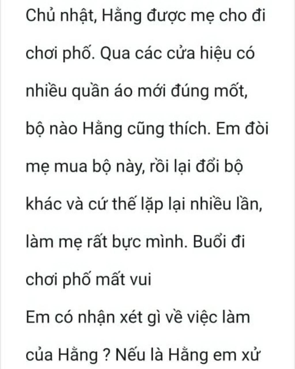-Việc làm của Hằng biểu hiện của một người không có tính tự chủ, Hằng chỉ nên cho phép mình mua một bộ đồ mà cảm thấy mình thích nhất để mua. Ngược lại, Hằng lại thấy bộ nào cũng thích cũng đòi mua.=>khiến bố mẹ bực mình