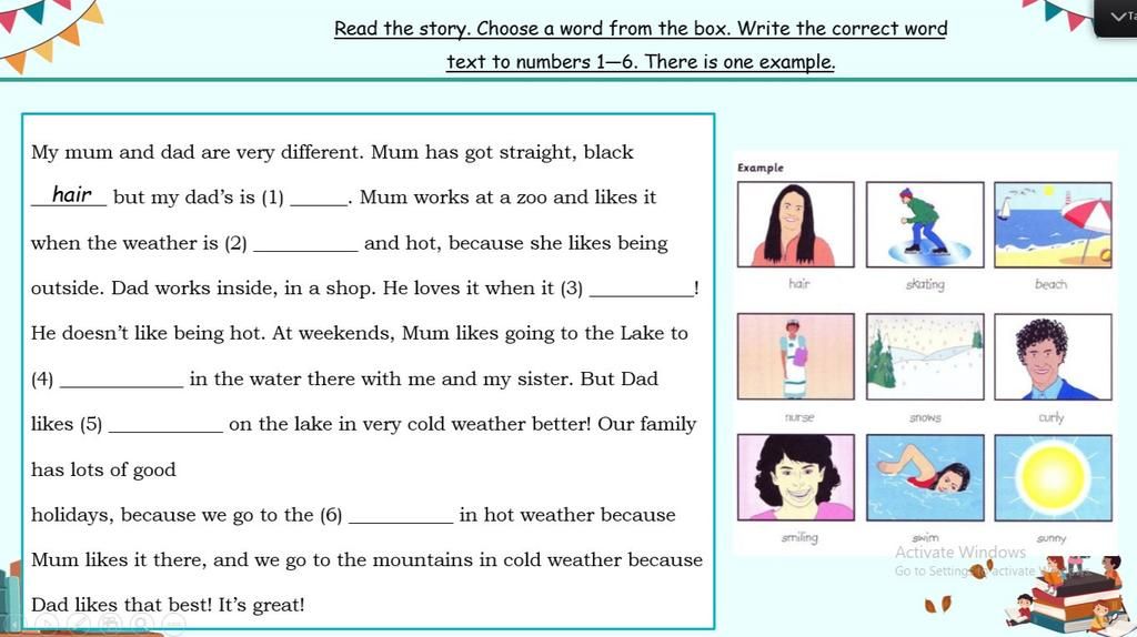 Bố và mẹ tôi rất khác nhau. Mẹ có tóc đen nhưng bố thì (1) xoăn. Mẹ làm việc ở sở thú và thích thời tiết (2) nắng và nóng, vì mẹ thích ở ngoài trời. Bố làm việc bên trong, trong một cửa hàng. Anh ấy thích nó khi trời (3) tuyết, anh ấy không thích nóng. Vào cuối tuần, Mẹ thích đi đến hồ để (4) bơi dưới nước ở đó với tôi và em gái tôi. Nhưng bố thích trượt băng (5) trên hồ trong thời tiết rất lạnh hơn! Gia đình chúng tôi có rất nhiều kỳ nghỉ tuyệt vời, bởi vì chúng tôi đi đến bãi biển (6) trong thời tiết nóng bức vì mẹ thích ở đó, và chúng tôi lên núi trong thời tiết lạnh vì bố thích điều đó nhất! Thật tuyệt vời!