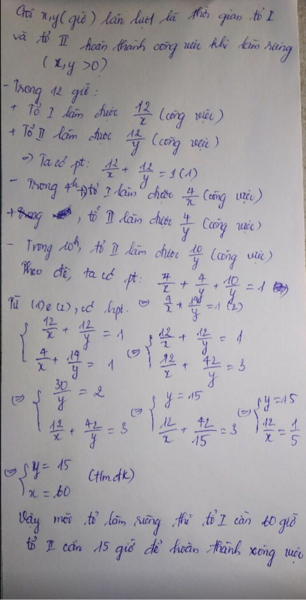 Gọi thời gian tổ `1` làm một mình xong công việc là $x \ (\text{giờ})$ `(x;y>12)`