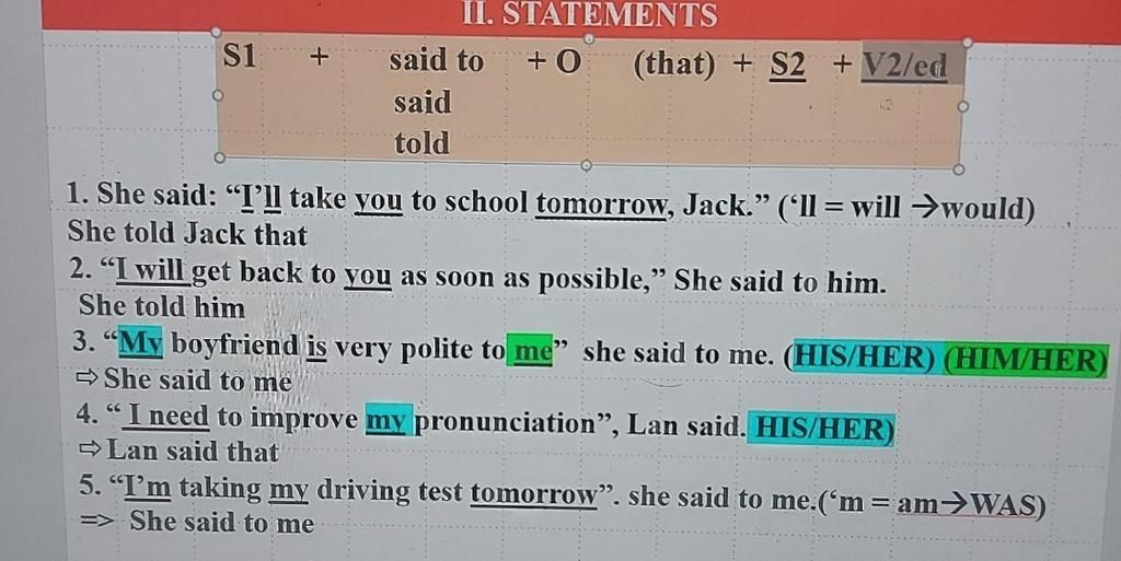 Cấu trúc câu tường thuật : S + say(s) / said hoặc tell / told + (that) + S + V