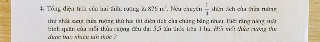 the bài ra , $\frac{3}{4}$ diện tích thửa ruộng 1 = $\frac{5}{4}$ diện tích thửa ruộng 2
