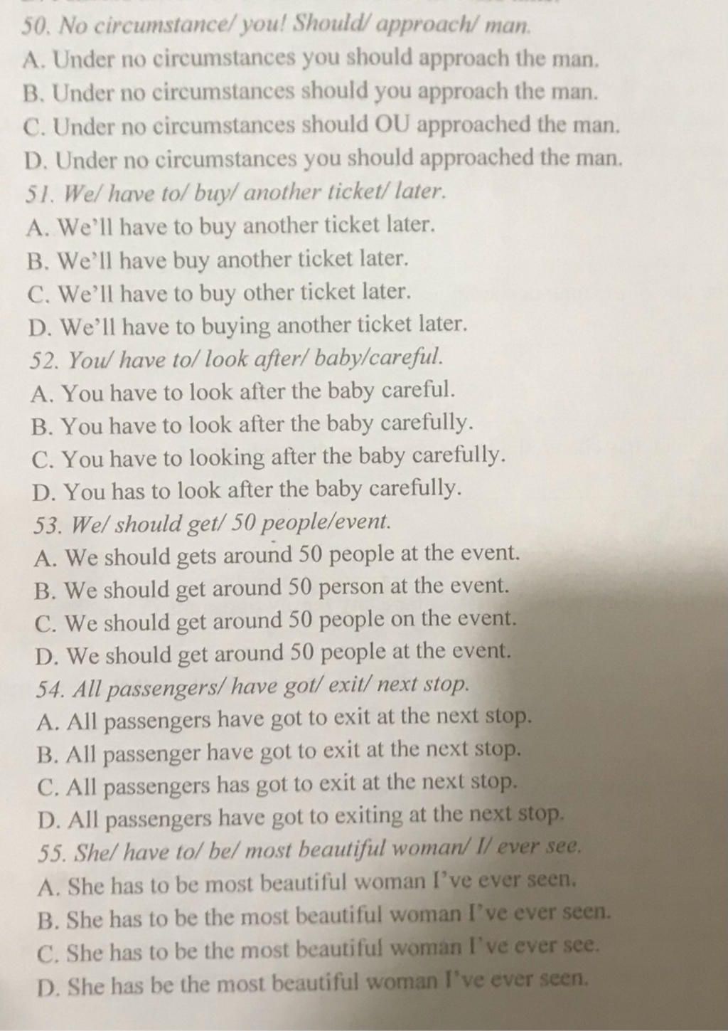 50. B under no circumstances + TĐT + S V(nguyên mẫu) ~ trong bất cứ hoàn cảnh nào cũng không