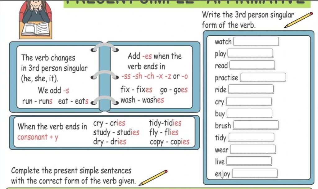 → Những động từ còn lại ta thêm s.→ Đối với động từ kết thúc bằng "phụ âm + y" thì bỏ “y” thêm "ies"