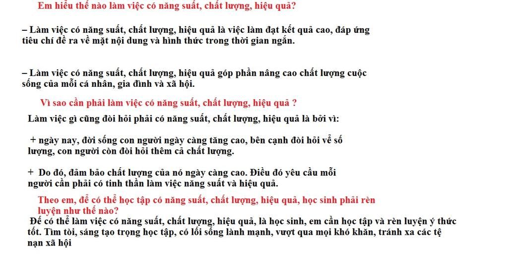 - Đế có thể làm việc có năng suất, chất lượng, hiệu quả, là học sinh, em cần học tập và rèn luyện ý thức tốt. Tìm tòi, sáng tạo trọng học tập, có lối sống lành mạnh, vượt qua mọi khó khăn, tránh xa các tệ nạn xã hội.