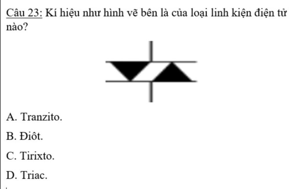 (Vì kí hiệu Tranzito có vòng tròn bao quanh, kí hiệu Điôt có 1 hình tam giác, kí hiệu Tirixto có 1 hình tam giác và thêm một đường thẳng từ đỉnh tam giác)
