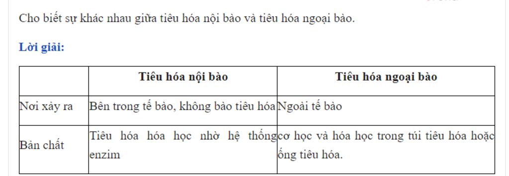 + Tiêu hóa nội bào là tiêu hoá thức ăn ở bên trong tế bào.Thức ăn được tiêu hoá hoá học trong không bào tiêu hoá nhờ hệ thống enzim.