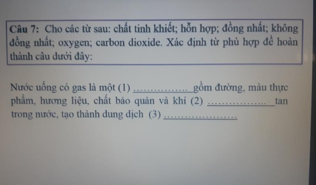 Nước uống có gas là một(1)hỗn hợp gồm đường,màu thực phẩm,hương liệu,chất bảo quản và khí (2)oxygen tan trong nước,tạo thành dung dịch đồng nhất.